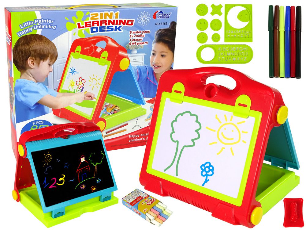 Nowa, edukacyjna, duża tablica zachwyci każdego małego fana prac plastycznych. Na tablicy można pisać flamastrem lub kredą, odrysowywać różne szablony.